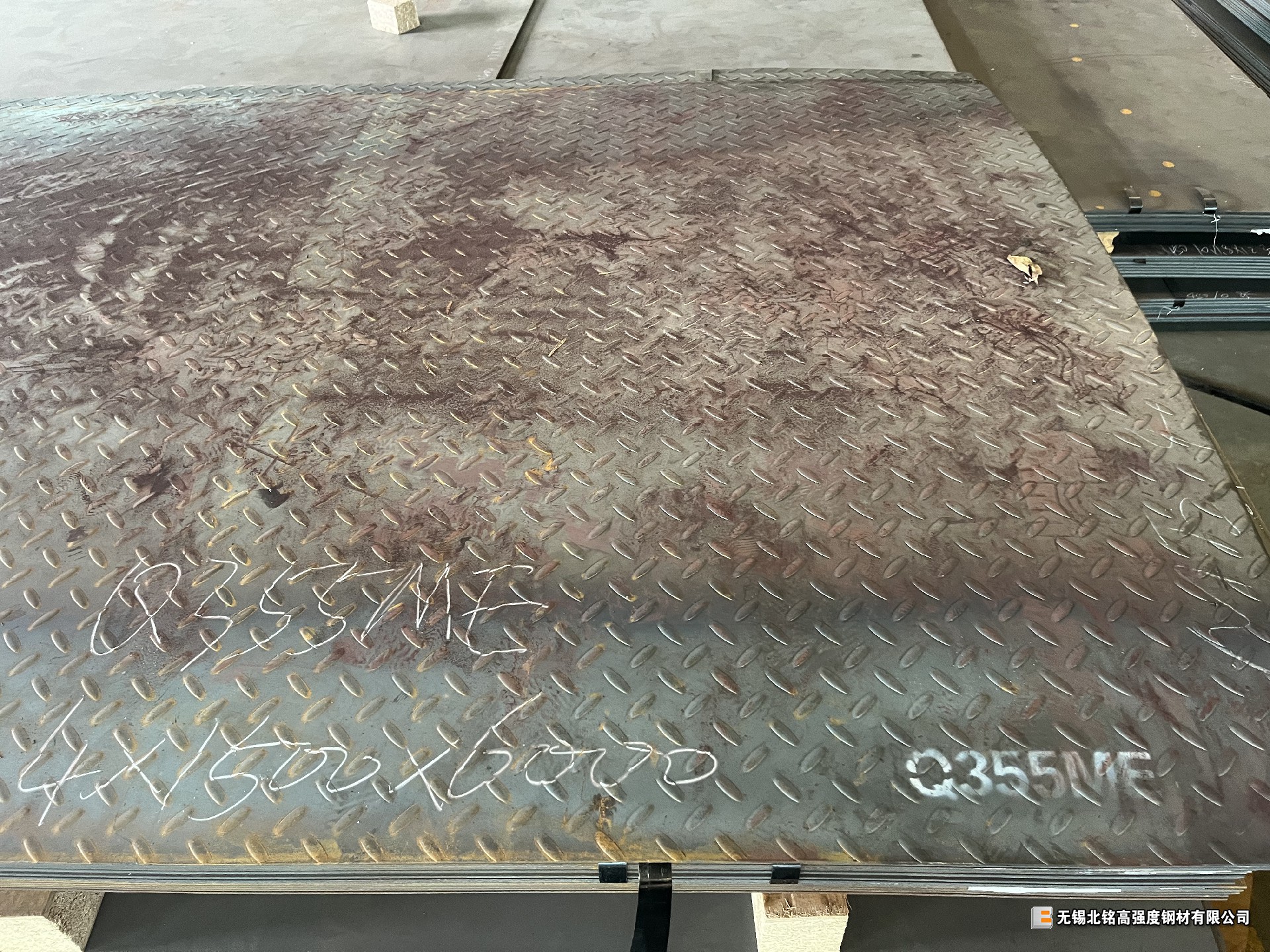 因客戶產(chǎn)品要求需要Q355ME花紋板,市面上花紋板現(xiàn)貨幾乎只有Q235B。經(jīng)多方了解。我司覺(jué)得用現(xiàn)貨Q355ME開平板發(fā)往加工廠壓花。試做后客戶對(duì)效果比較滿意。本次我司共加工Q355ME花紋板26噸。
